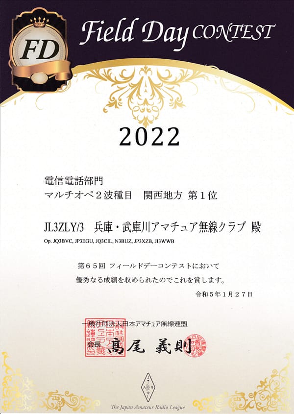 光栄な表彰状を日本アマチュア無線連盟様より頂きました。(2023.2.2追記)